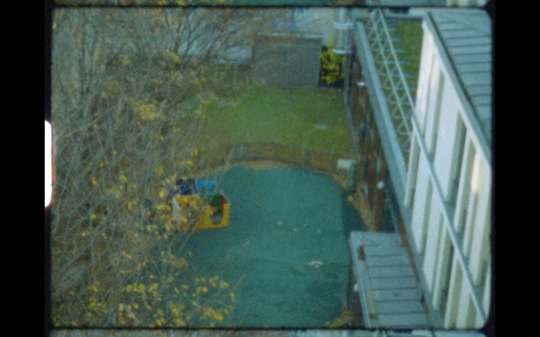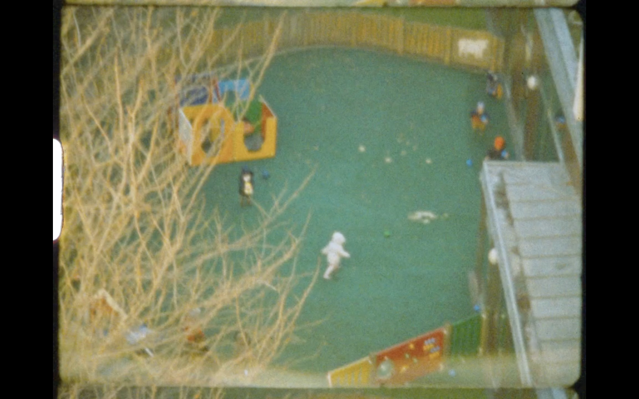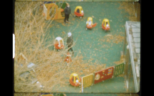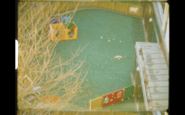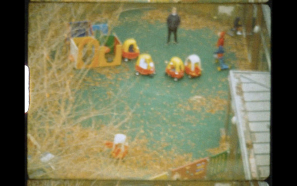View into an inner courtyard in the fall. Court of a nursery. The children get to run and play. A few film clips during various times. In the meantime the tree is loosing its last leaves. At some point the kids stop playing and their trolleys are being put aside.